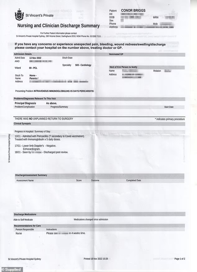 Conor soon struggled to climb stairs, breathe comfortably or lie flat. Doctors later diagnosed pericarditis, an inflammation around the heart. Although most cases linked to vaccination are mild and short-lived, his symptoms persisted.