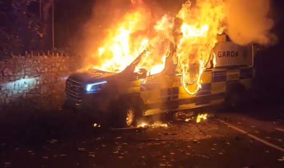 Crowds gathered outside the building in protest — what began as quiet outrage soon erupted into chaos. A police van was set on fire, and clashes with officers filled the streets. “People came here to support that little girl,” said local councillor Dermot Richardson. “But fear and anger took over — violence helps no one.”