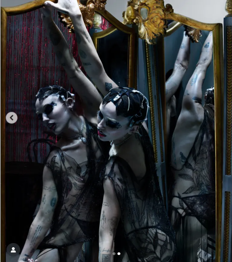 While the editorial included angel wings and vintage-style golden lingerie, one specific image stole the spotlight. Cyrus posed in a daring, sheer black beaded dress that left little to the imagination. Standing before an ornate mirror with sharp eyeliner and her signature red lip, the avant-garde look sparked an immediate debate online.