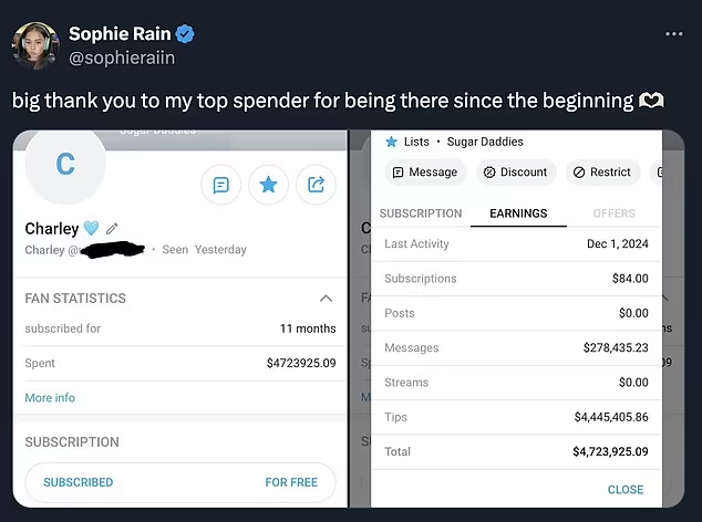 Rain has kept her name in headlines since announcing her earnings. This week, she posted more receipts on X. She said her biggest “sugar daddy” spent $4.7 million on her in less than 12 months. She thanked the spender for supporting her “since the beginning.”