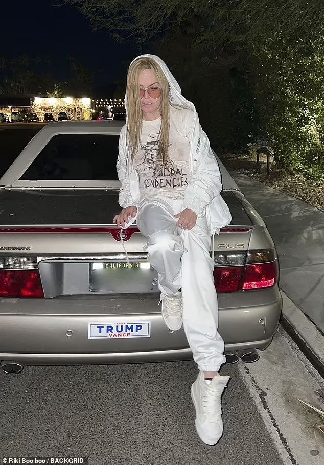 Taryn Manning, 46, was spotted in Los Angeles this Monday. She looked disheveled while sitting on a car trunk.