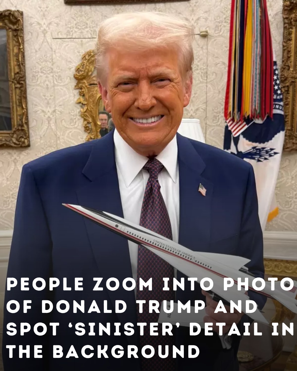 A recent Oval Office photo of Donald Trump holding a model of the Overture One supersonic jet has gone viral—not for the futuristic aircraft, but for an eerie background detail.
