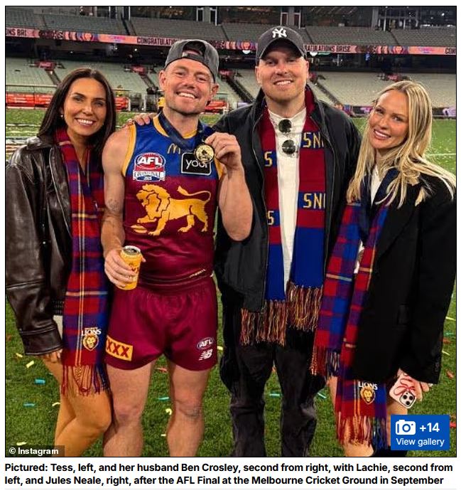 Brisbane Lions captain Lachie Neale, 32, was caught in a car with Tess Crosley. Crosley is a former Mormon missionary and the best friend of Neale’s wife, Jules. The pair were reportedly caught in a clinch by another teammate’s partner. Jules described the secret affair as an “unimaginable betrayal” on social media. Reports suggest the tryst began more than three months ago.