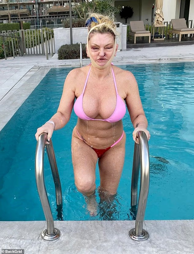 She underwent extensive procedures, including a full face, neck, and brow lift, as well as reconstruction of her nose and lips. The surgery took place at a hospital in the UAE. Photos show her with visible bandages and bruising as she heals.