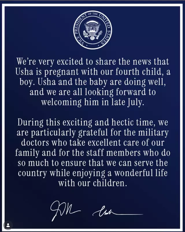 The Vances already have three young children and said the family is excited to welcome another addition. They also expressed appreciation for the medical professionals who support their family while JD Vance continues his duties in public office.